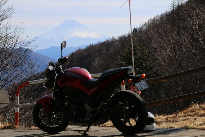 柳沢峠で富士山をバックにNC750S(2021年2月)