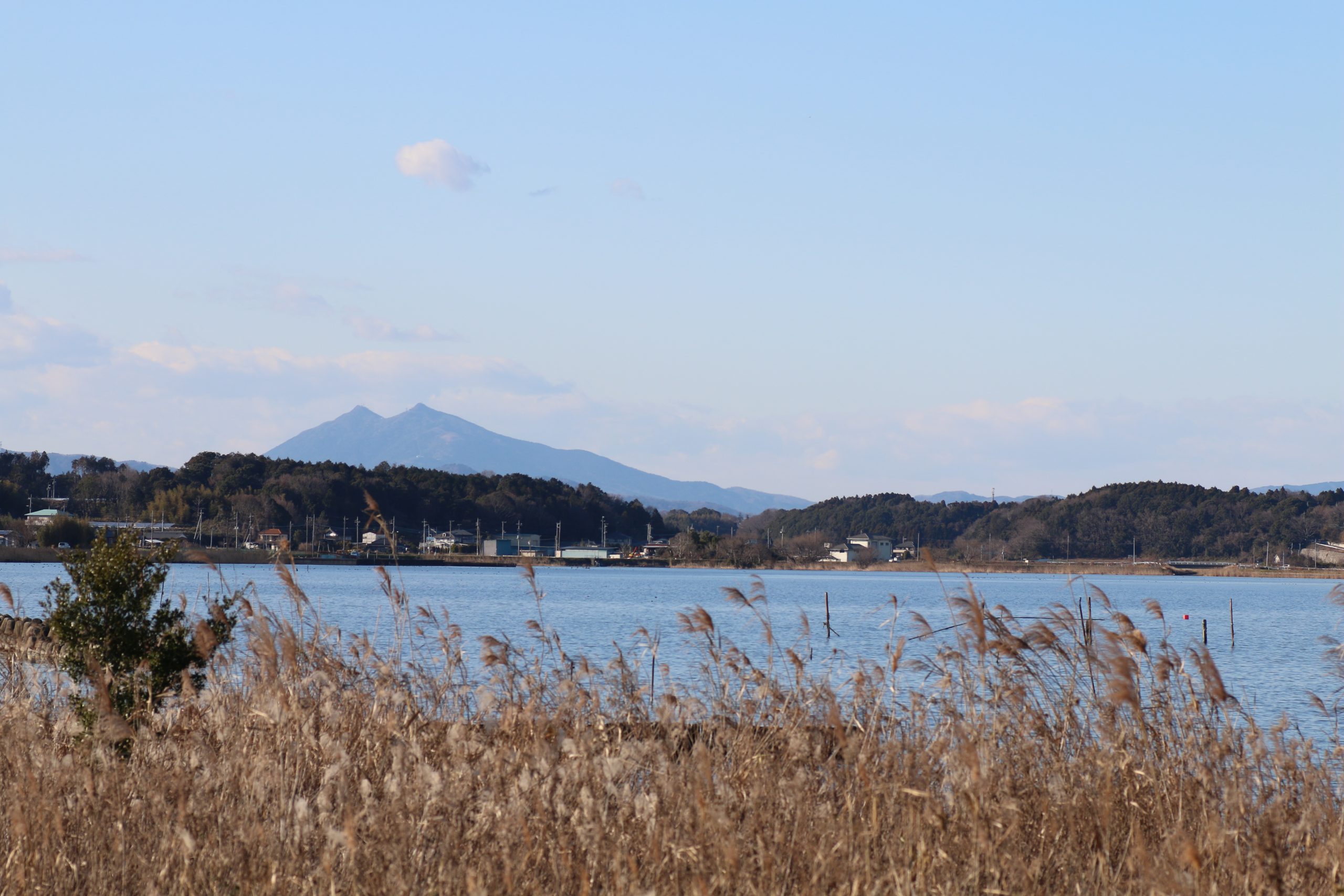 霞ヶ浦から北西方向に筑波山が望めます。筑波山頂上と女体山頂上が特徴的です。