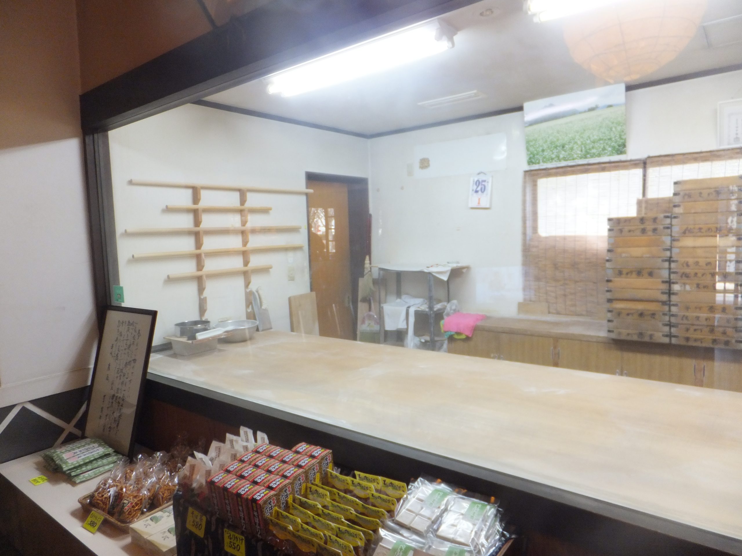 今回のそばを食べたお店はタイミングがよければそば打ちを待合スペースの前で実演します。この日はタイミングが合いませんでした。