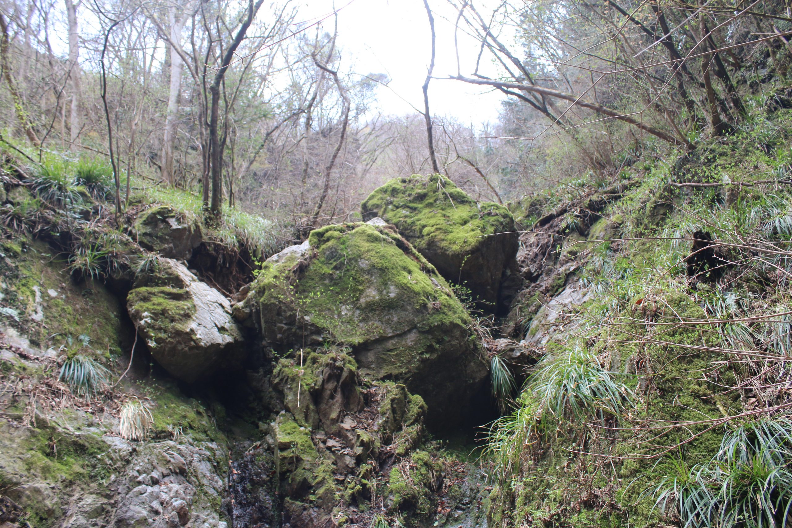 単なる苔むした岩ですが周りの雰囲気と合わさっていわくありげです
