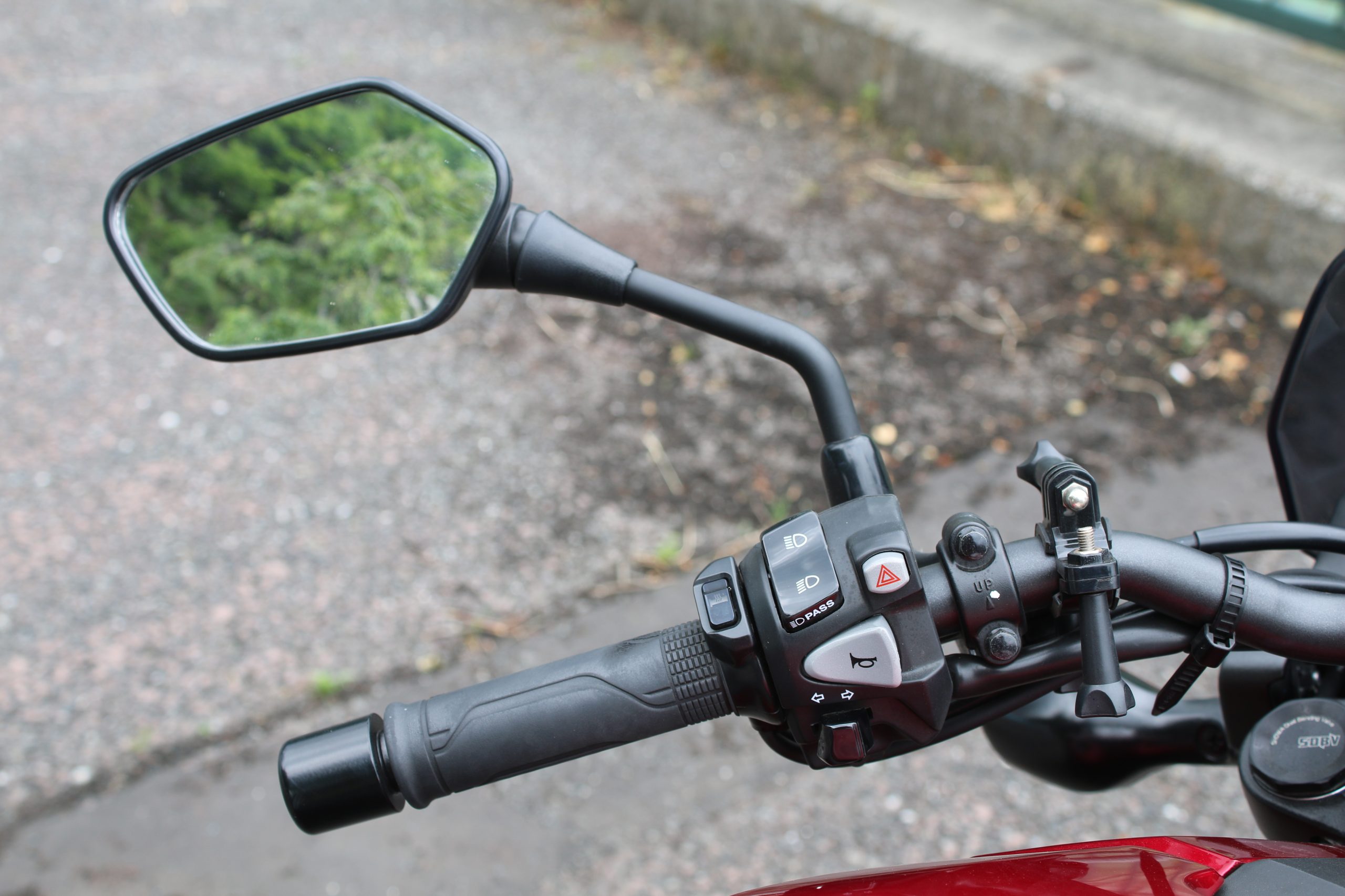 NC750Sの左ハンドル、スイッチ類の右側に見えているのはアクションカムのステーです