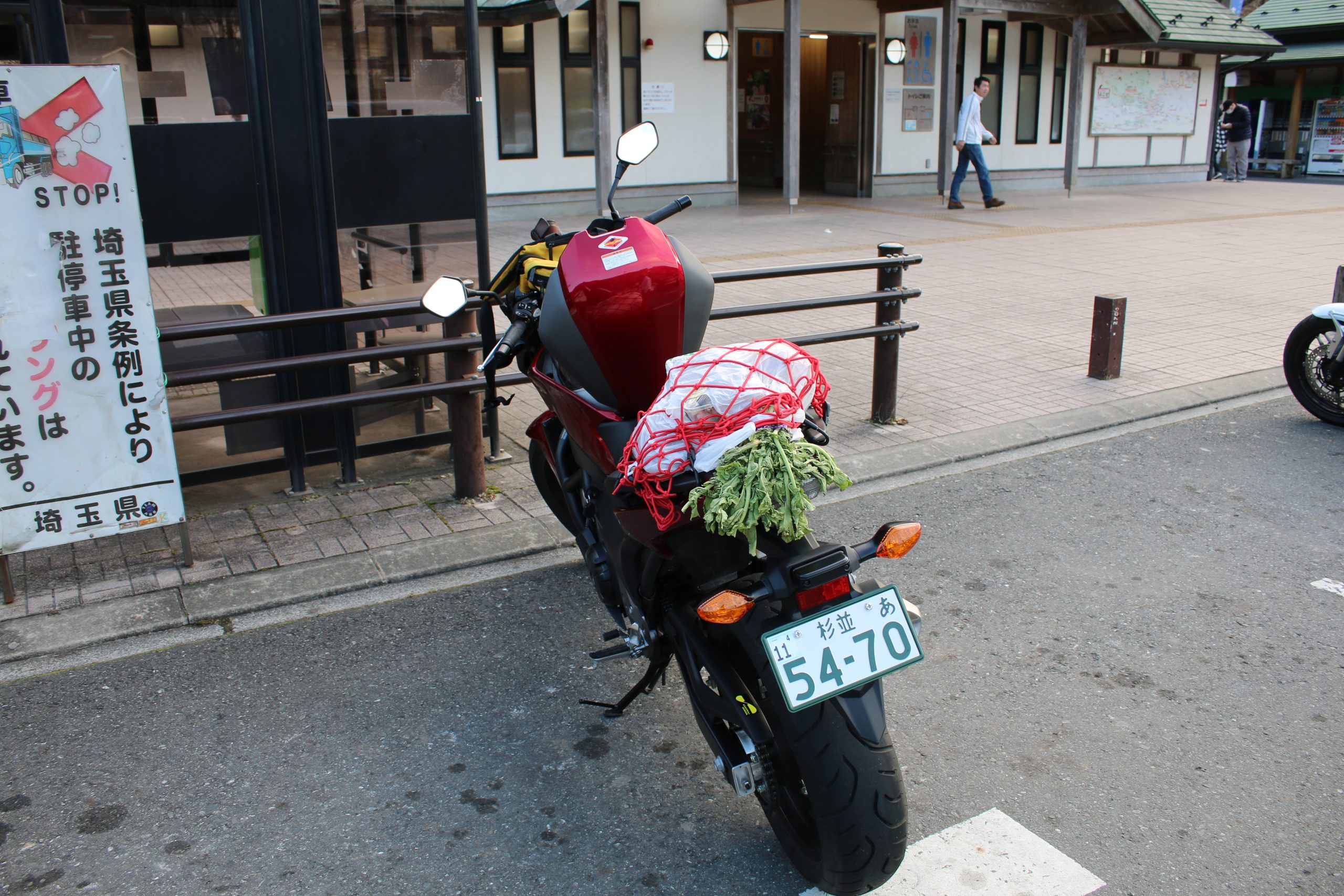 購入したお土産を乗せたNC750Sです。荷造り中なのでフロントのラゲッジスペースも開けています。少し異形のルックス?
